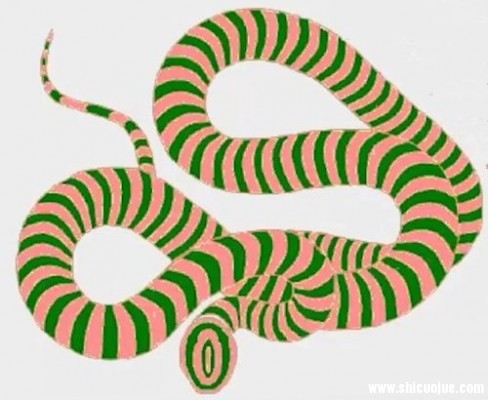 简介:这个蛇本身是静止的,然而通过身体颜色的变化,蛇的身体看似动了起来。这还不够,作者尝试用较为突出的颜色当成主体部分前景色和颜色没那么突出的当作背景色,当颜色发生变化时,蛇身体蠕动的方向也随之改变。通过观察发现,两种颜色的相对亮度发生改变时,蛇身体蠕动的方向就会改变,但是无论颜色怎么变换,始终是前景色决定了蛇身体蠕动的方向。